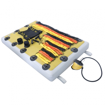 说明:专业不稳定训练平台,底部充气灌水用于稳定,平面有14个拉环,配三种不同阻力训练绳各8根,配有专业脚踝,手腕绑带,以及弹力训练服一件,可用于身体全方位的训练。